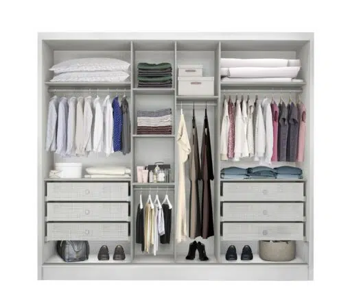 - Organização: Amplo espaço interno com prateleiras e gavetas bem distribuídas para organizar roupas, acessórios e muito mais.